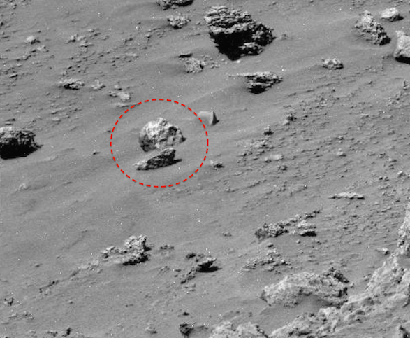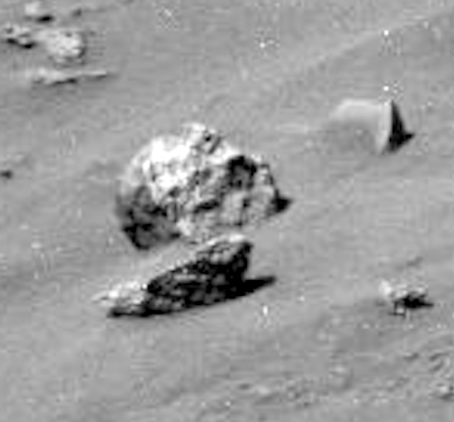 Right away this object in the photo just grabs you. An alien skull with the jaw bone missing or buried below it. You can make out the nasal cavity and the two eye sockets without any trouble. You can even make out the ridge above the eye sockets. The skull extends back a little more than a human skull would, making it 15-20% longer than ours. Overall this is a great discovery by Paranormal Crucible of Youtube. Its hard to believe that the rover just passes on by without a second look, but hey, they are not there to discover life, but actually there to distract humanity and show an effort. This way...satisfying human curiosity. Are you...satisfied? I'm not. SCW